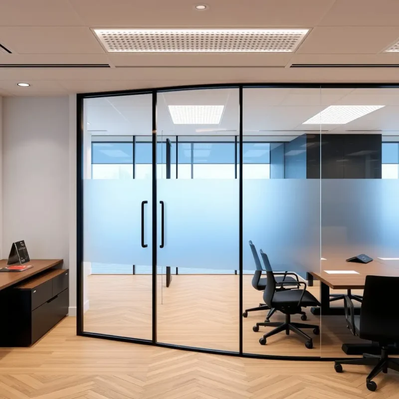 Slim profile glass partitions with precision-engineered aluminum frames, designed for seamless integration. Ideal for modern interiors needing transparency, acoustic performance, and a clean, minimal aesthetic.